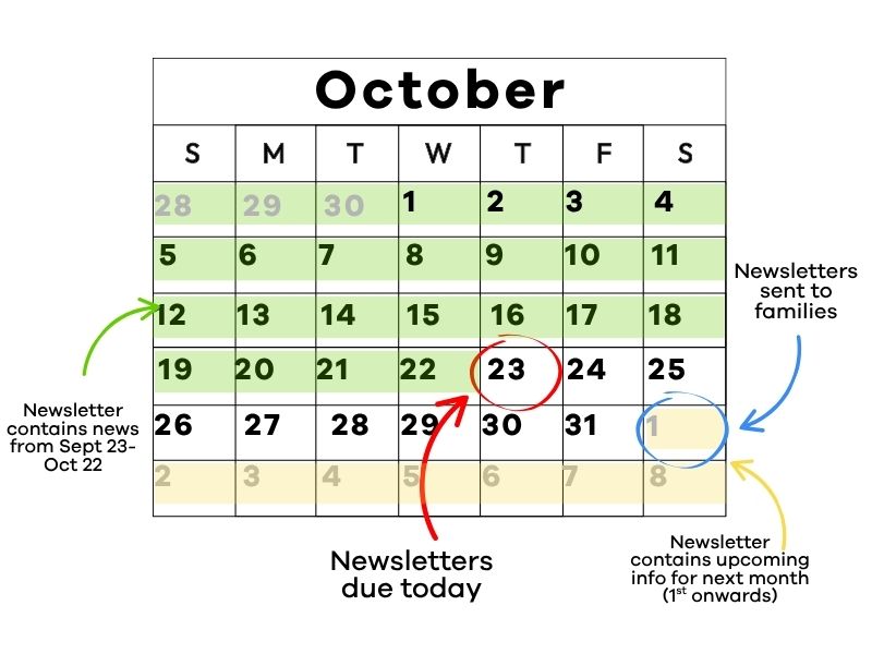 Newsletters are sent out on the 1st of each month—so your October 23 submission will land in families’ inboxes on November 1.